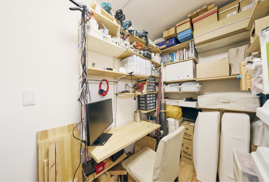 納戸の壁3面に可動棚「シューノ」。デスク天板もプラスして作業スペースを確保HOUSTO おウチの収納.com。
