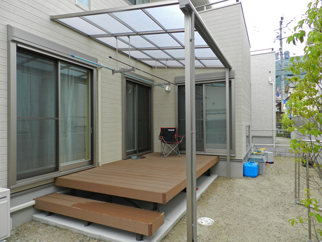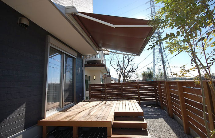 洗濯物干しに便利なウッドデッキ&折りたたみ屋根 雨よけ屋根・日よけ屋根 付きウッドデッキ施工例神奈川県のウッドデッキ ・造園・外構・エクステリアまで住宅リフォームを提案する株式会社グリーン・パトロール。