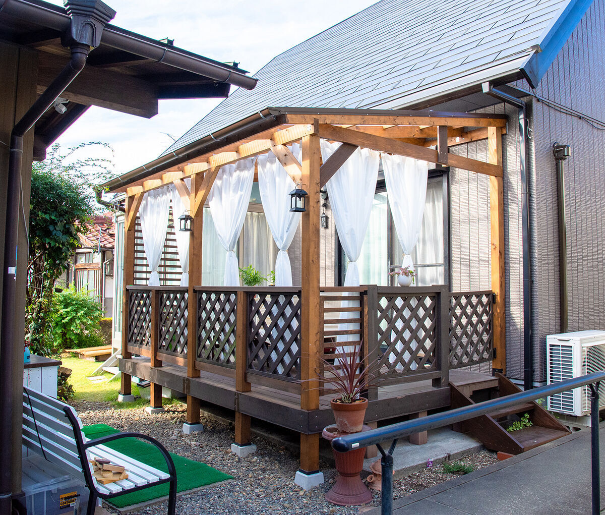 東屋ウッドデッキ・屋根付きパーゴラに工夫がいっぱい - リーベDIYウッドデッキ大賞。