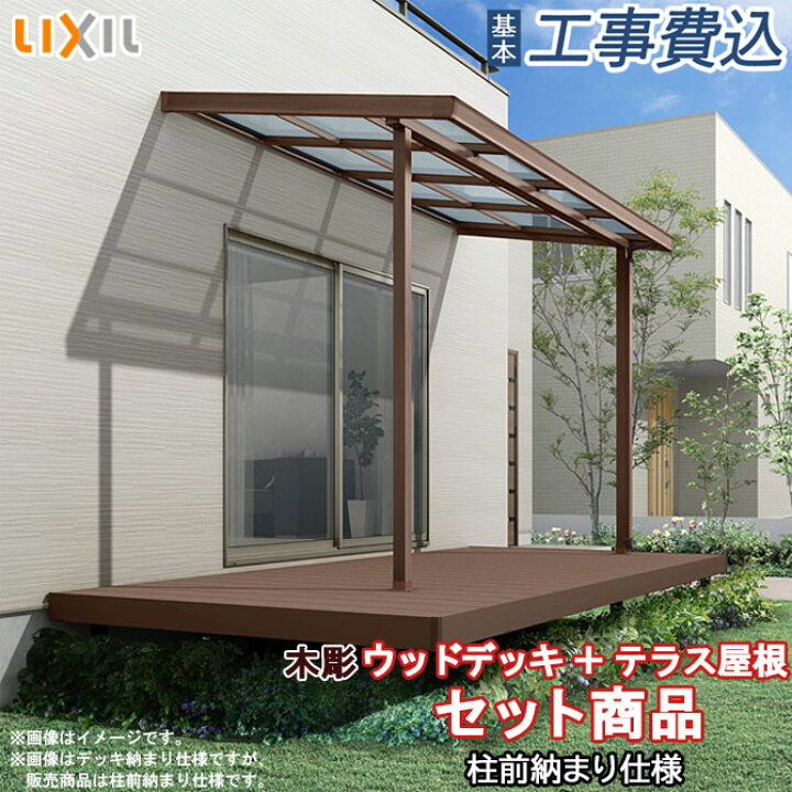 楽天市場 ウッドデッキ + テラス屋根 セット商品 樹ら楽ステージ 木彫 + シュエット セット LIXIL基本工事費込みデッキ:ロング束柱・幕板Aテラス屋根 : ポリカ屋根材・600タイプ人工木 樹脂 木調 木目 テラス 屋根 工事付 施工 人気 おすすめ。