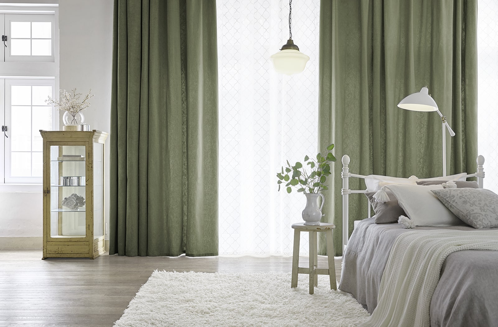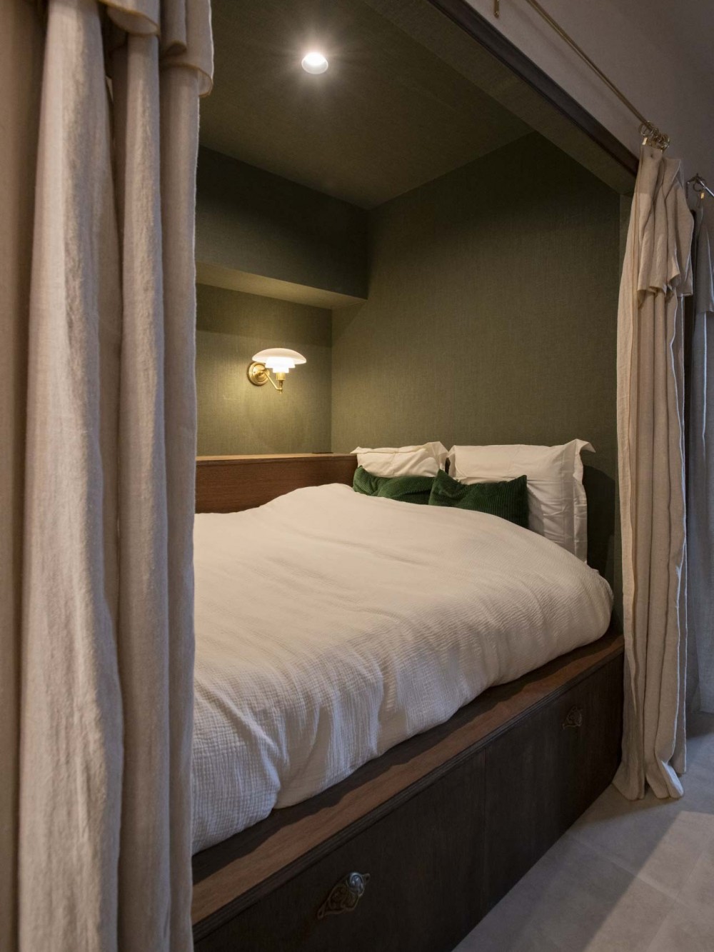 寝室の壁は薄い緑です。 英国アンティーク家具の似合う家- ベッドルーム事例SUVACO スバコ。