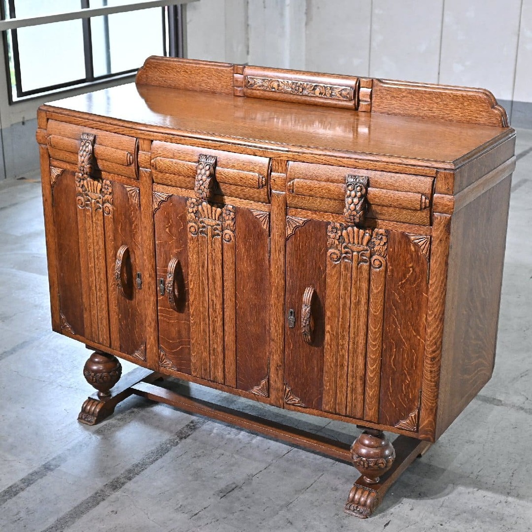 GEOGRAPHICA overture店1930年代頃、オークのベッド。 バーリーシュガーツイストのコラムが配された英国アンティークらしく雰囲気の良いひと品。幾何学的な模様と曲線的な植物モチーフが見事に融合した美しいレリーフもポイントです🌱 中央のオーバルの意匠がカメオの。