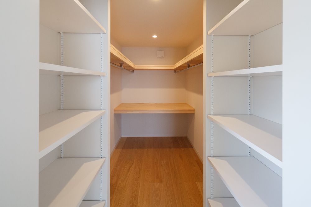 2階廊下から入れる家族共有のウォークインクローゼット。コの字型で収納力をアップし、バッグや靴を置けるよう床から30cm上げた棚板も用意 くふ。