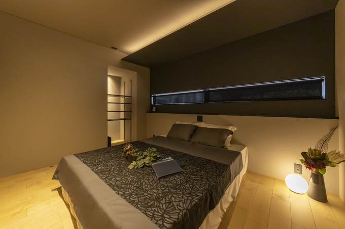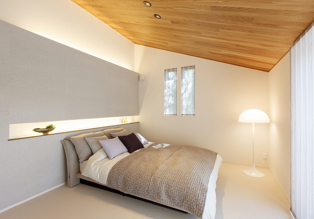 夫妻の寝室は間接照明などを用いてホテルライクな雰囲気を重視。ベッドヘッドは壁をふかして携帯電話などが置けるようにしている くふうイエタテ。