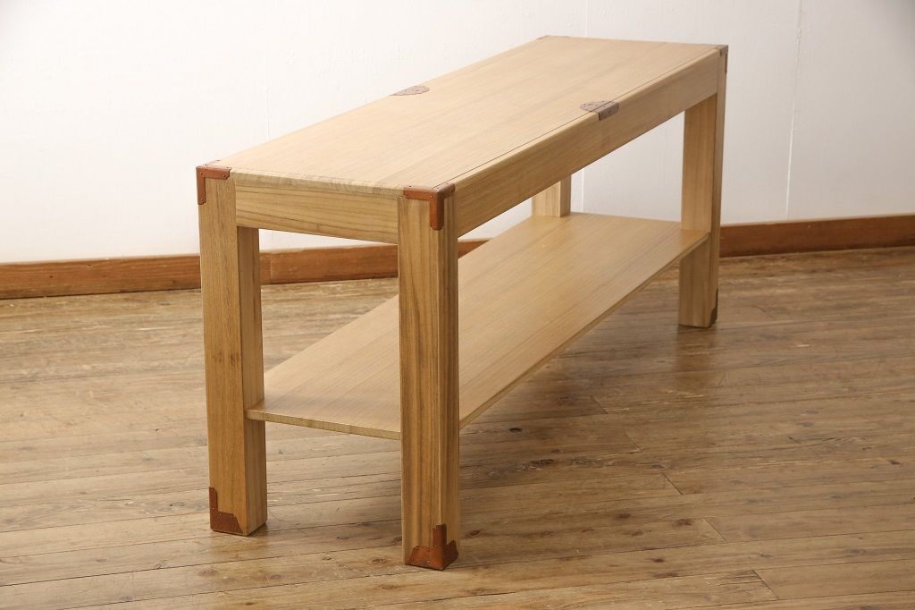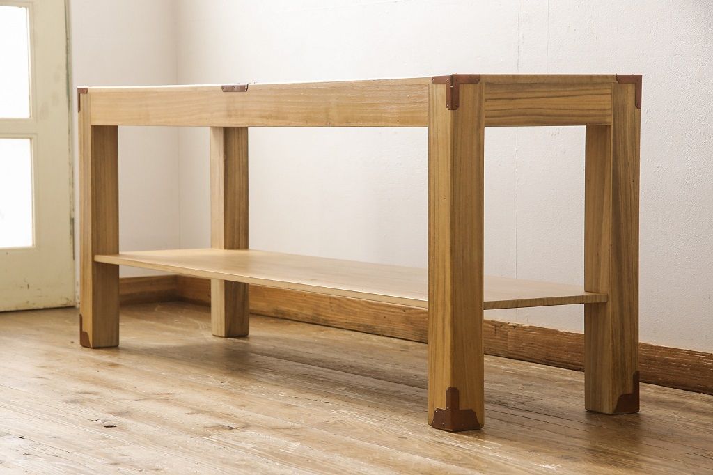 公式 アンティーク家具ラフジュ工房商品詳細ページ長持をテーブルにリメイク!脚は長持 の材料を剥ぎ合わせて制作、天板には蓋部分に取り付けられていた金具を移設。棚板を取り付けて、汚れを洗浄しウレタン塗装仕上げに。