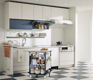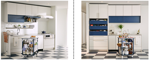 栗原はるみプロデュース『harumi's kitchen』 使いやすくて、楽しくて、自由なキッチン!!カウンター下には自由に移動できる可動式ワゴン、「ワークトップワゴン」が付いています。