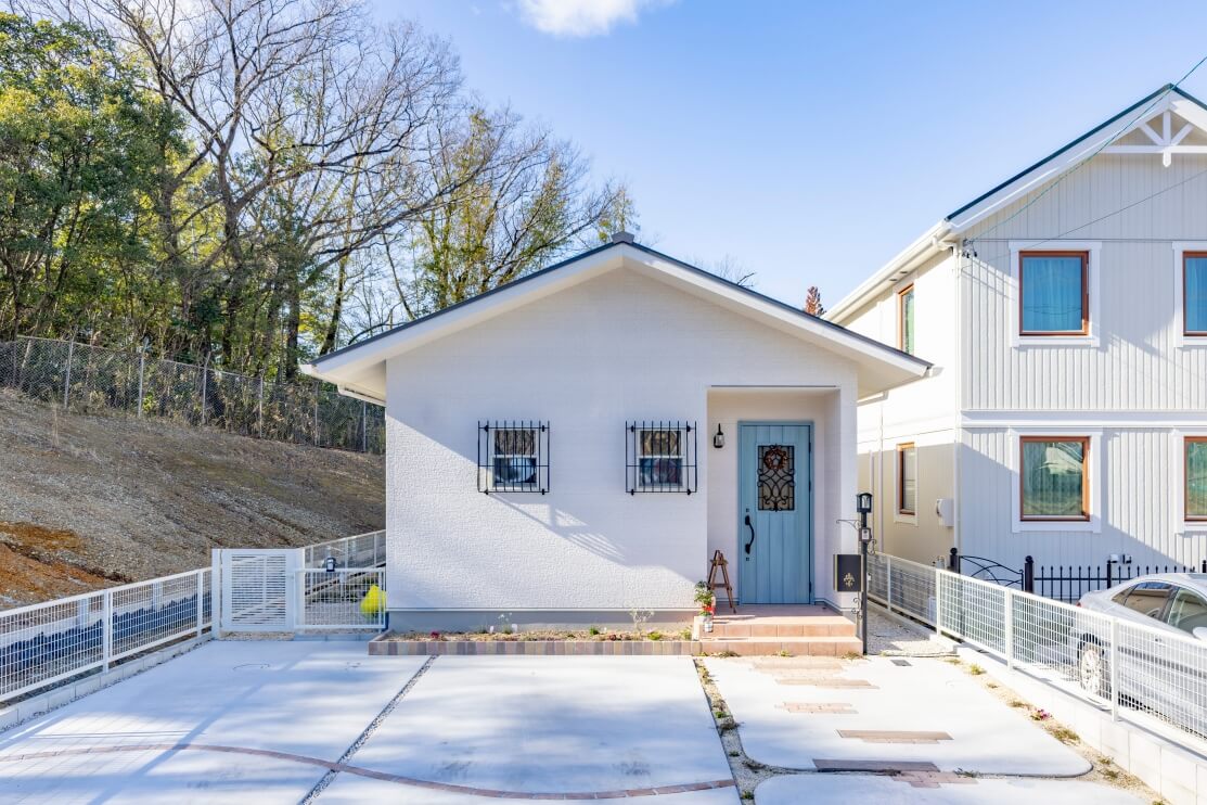 さわやかなスカイブルー×白の外観が印象的な木の香りただよう大人かわいい平屋しんせつハウス。