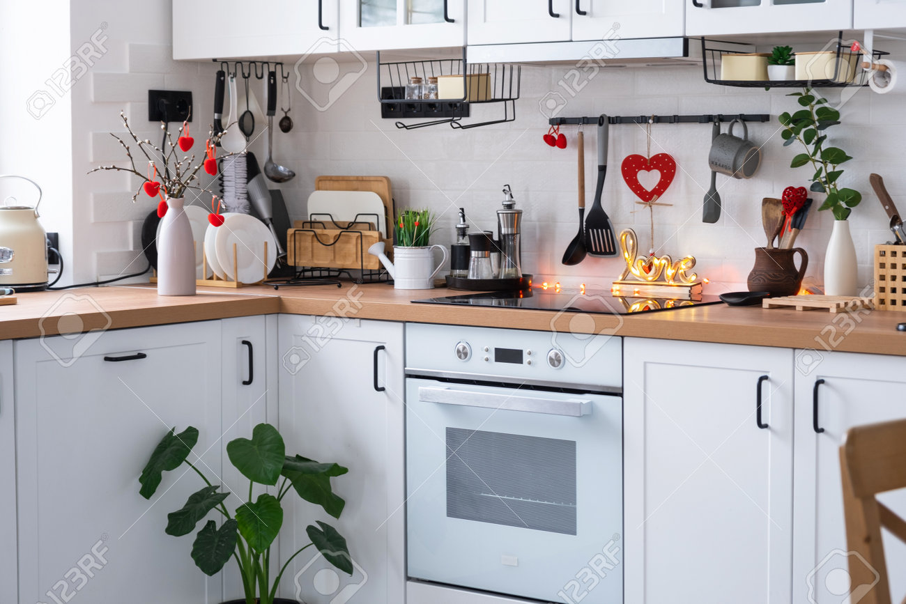 家のキッチンのインテリアは、バレンタインデーの赤いハートで飾られています。テーブルの上の装飾、ストーブ、調理器具、家族の巣の中のお祭り気分の写真素材・画像素材Image 198158110。