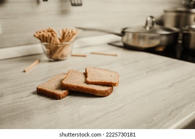 テーブルの上のライ麦パン。ストーブの上の皿。写真素材2225730181Shutterstock。