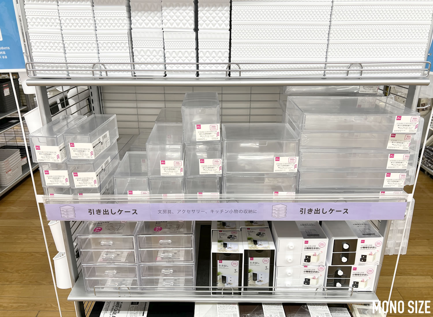 100均「重なる透明収納ケース 1段引出し 幅6.6cm」の商品情報とサイズ・収納例。ダイソーで販売 4549131979589。