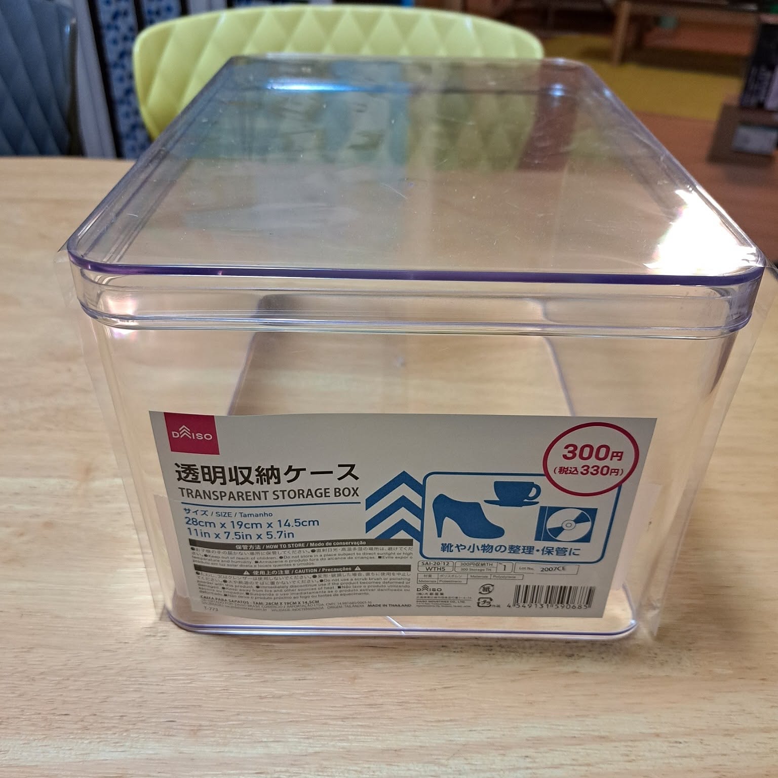 100均「収納ケース クリア・フタ付」の商品情報とサイズ・収納例。ダイソーで販売 4549131496017。