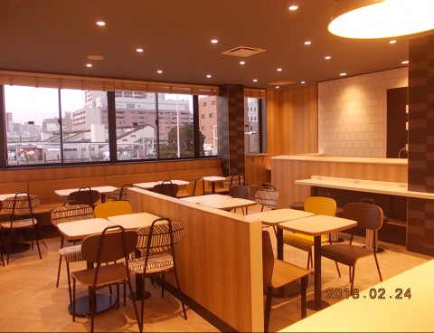 事業用施設の事例:マクドナルド沼津駅北口店Re-image工事 沼津市 マクドナルド 沼津駅北口店Re-image工事2階のイートインスペースはパーテーションを外し広い空間が生まれ、内装はシックで落ち着いた印象に変わった株式会社前田建設。