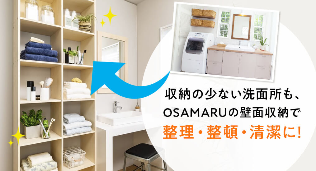狭い洗面所がおしゃれ空間へ!流しの下にアレコレ詰め込む収納から壁面収納へ変えるだけでストレスフリーに!壁面収納・本棚 OSAMARU オサマル。