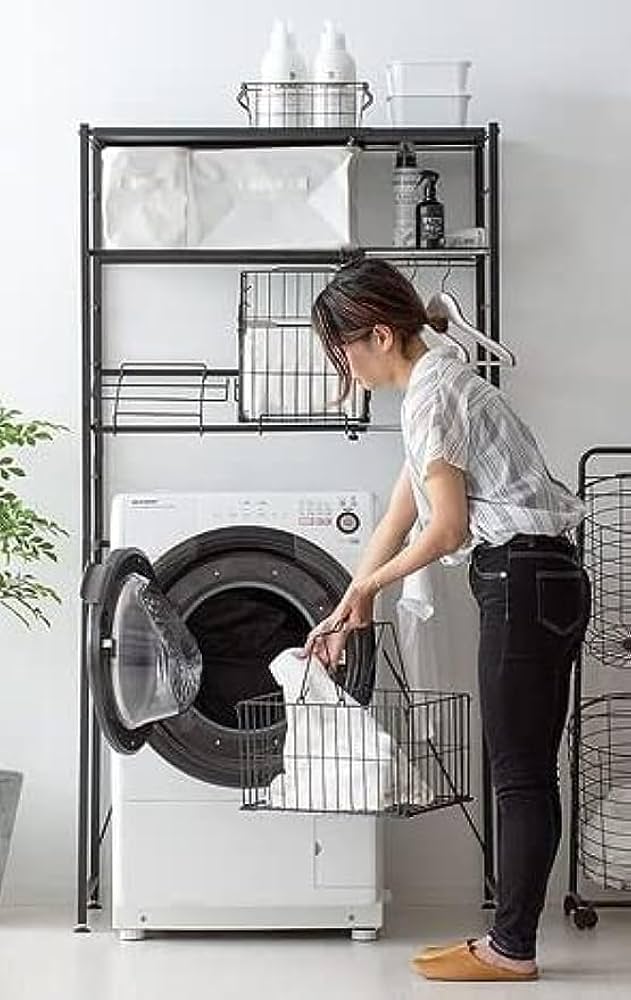 Amazonランドリーラック 防水パン おしゃれ 洗面所 バスケット付 伸縮ラック 洗濯機上収納 洗濯ラック 洗面所 収納 大容量 ラック ランドリー 収納 可動棚 スリム 縦型 一人暮らし 洗剤収納 脱衣所 ストレージ ブラックランドリー収納 オンライン通販。