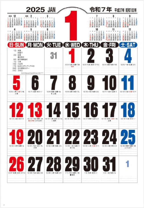 2025年シンプル大きい壁掛けカレンダー書込み式。