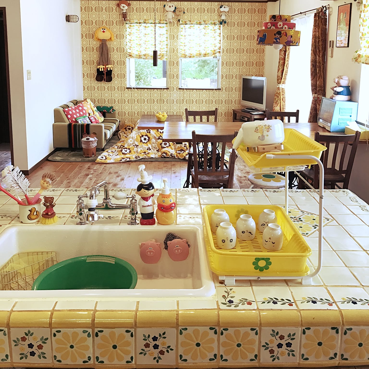 昼下がりの団地キッチンと昭和のコタツ❣❣ こたつカバー、友達から貰ったカバーに変えてみました!! 明るくなってこれもかわいいなぁ *´ч`**昼下がり西日昭和昭和レトロ昭和感懐かしいノスタルジーノスタルジックこたつレトロこたつ団地団地。