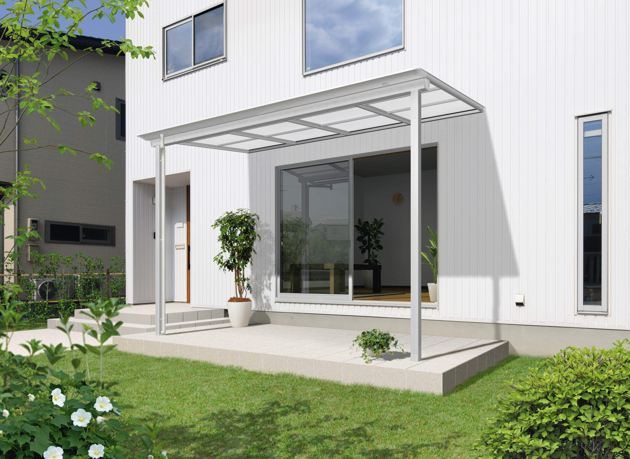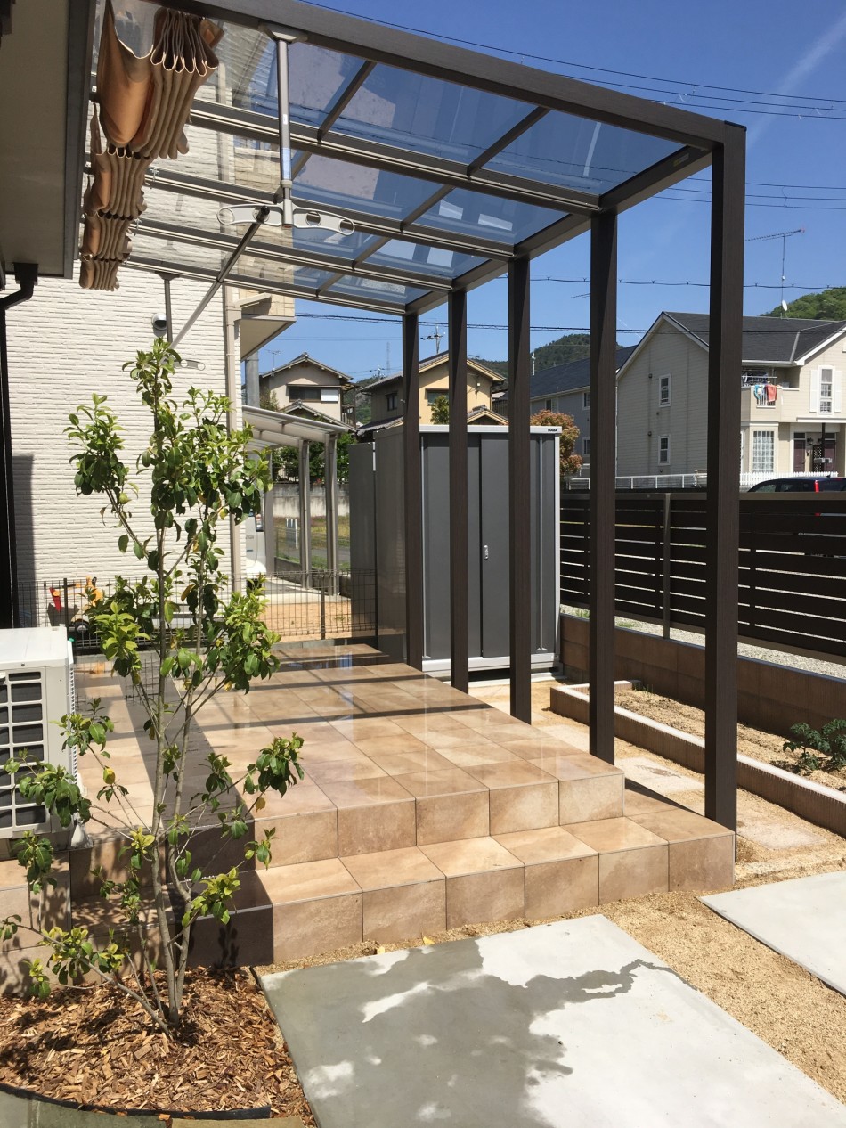 タイルデッキとオシャレなテラス屋根でくつろぎ空間 相生市兵庫県 たつの市ガーデン・エクステリアガーデンコーディネート。