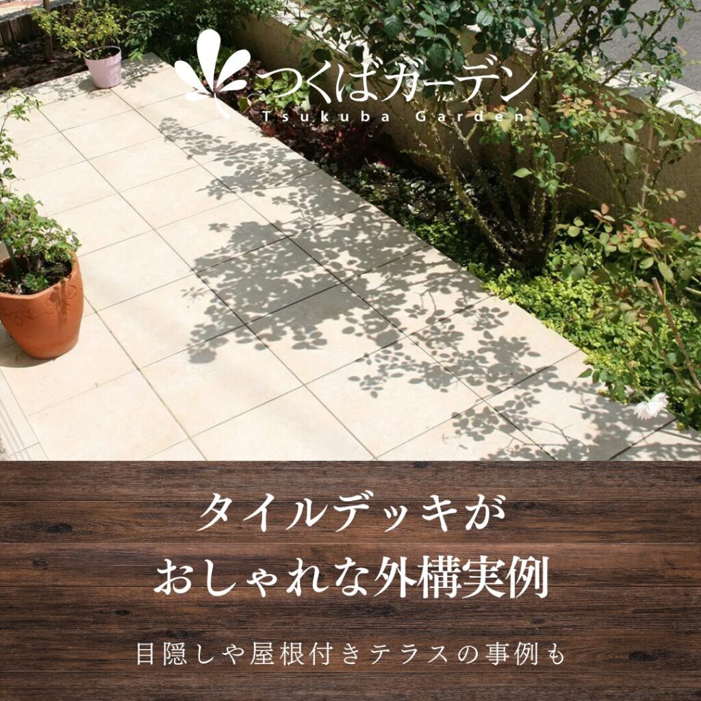 タイルデッキがおしゃれな外構実例目隠しや屋根付きテラスの事例もつくばガーデンイオンモールつくばエクステリア展示場。
