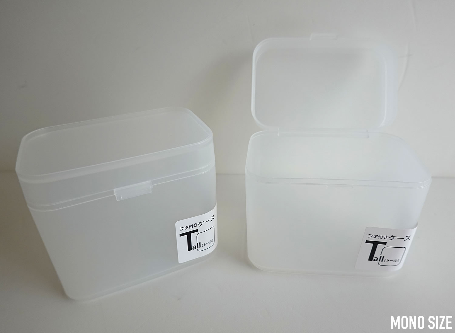100均「フタ付きケース トール クリア」の商品情報とサイズ・収納例。セリアで販売 4977425201441。
