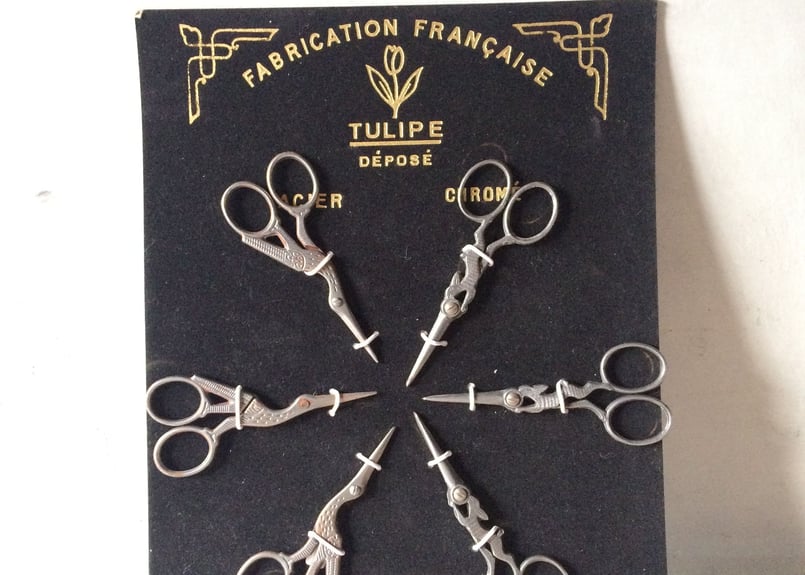 アンティーク はさみフランス 手芸用はさみ 刺繍ばさみ 6本セット 黒いベルベット調の販促用台紙付きアンティーク雑貨通販ショップClotte。