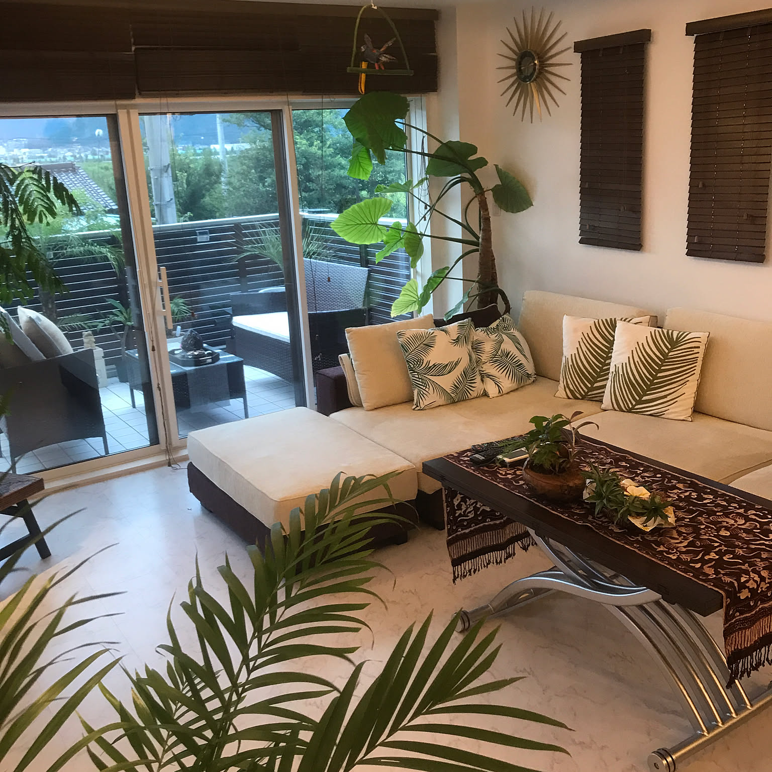 生活の忙しさの中で、自然を感じ穏やかな癒しの空間に身を置きたい!, ボタニカルインテリアはまさにその答え。, 植物や自然素材を取り入れたこのスタイル,心を落ち着かせ、毎日をリフレッシュさせる力があります。, 2階生活の私にとっては、, このグリーン達がとても癒しです。, 本物でなくても,グリーンには癒し効果が。, フェイクグリーンも上手に使いながら, 呼吸する壁。珪藻土の色もまさに土色。,。