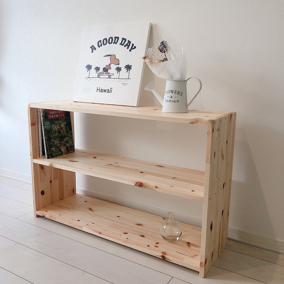 um ハンドメイド 一枚板で作るオモチャ棚w64モンテッソーリ DIY オープンなおもちゃ棚。