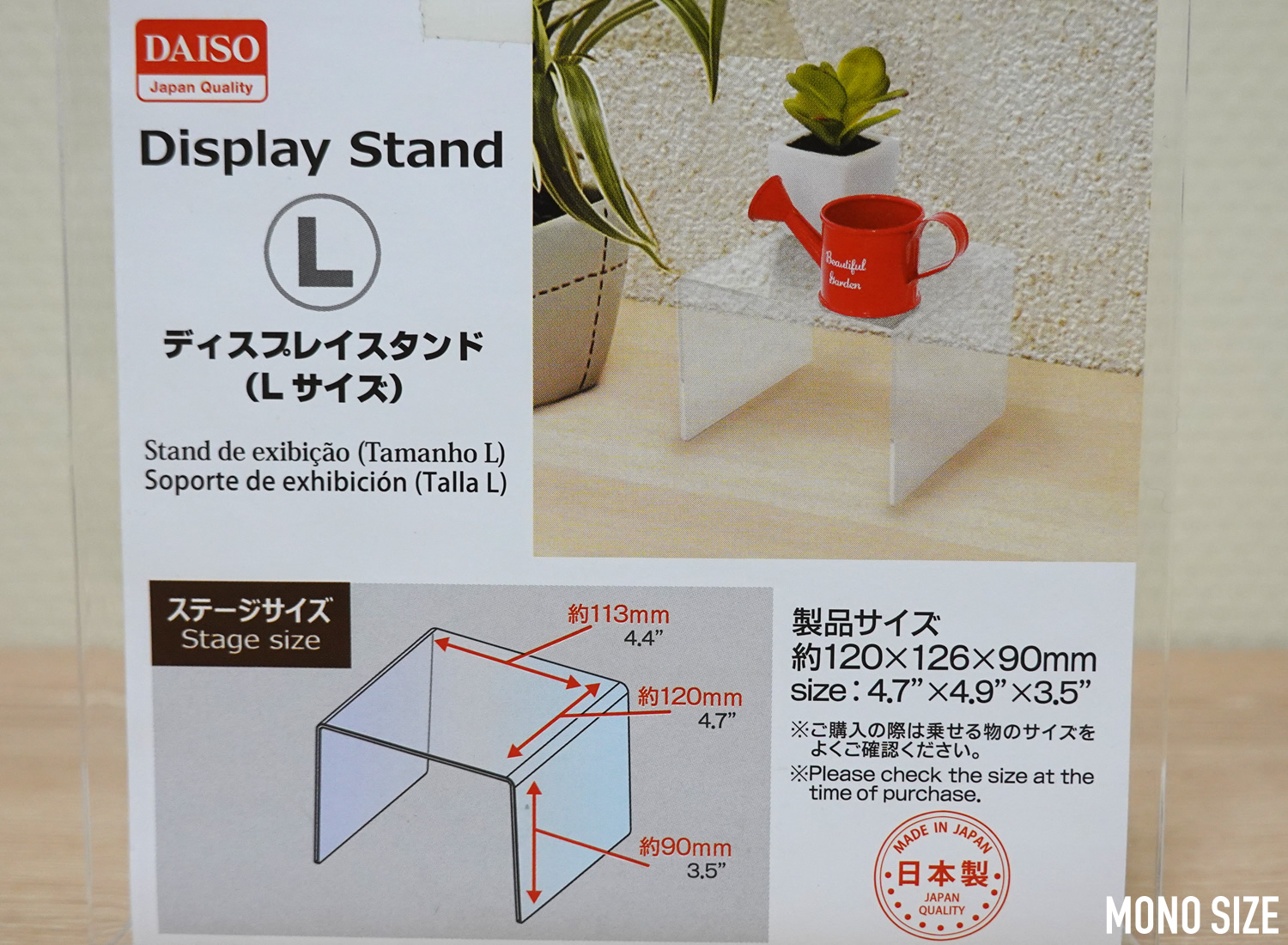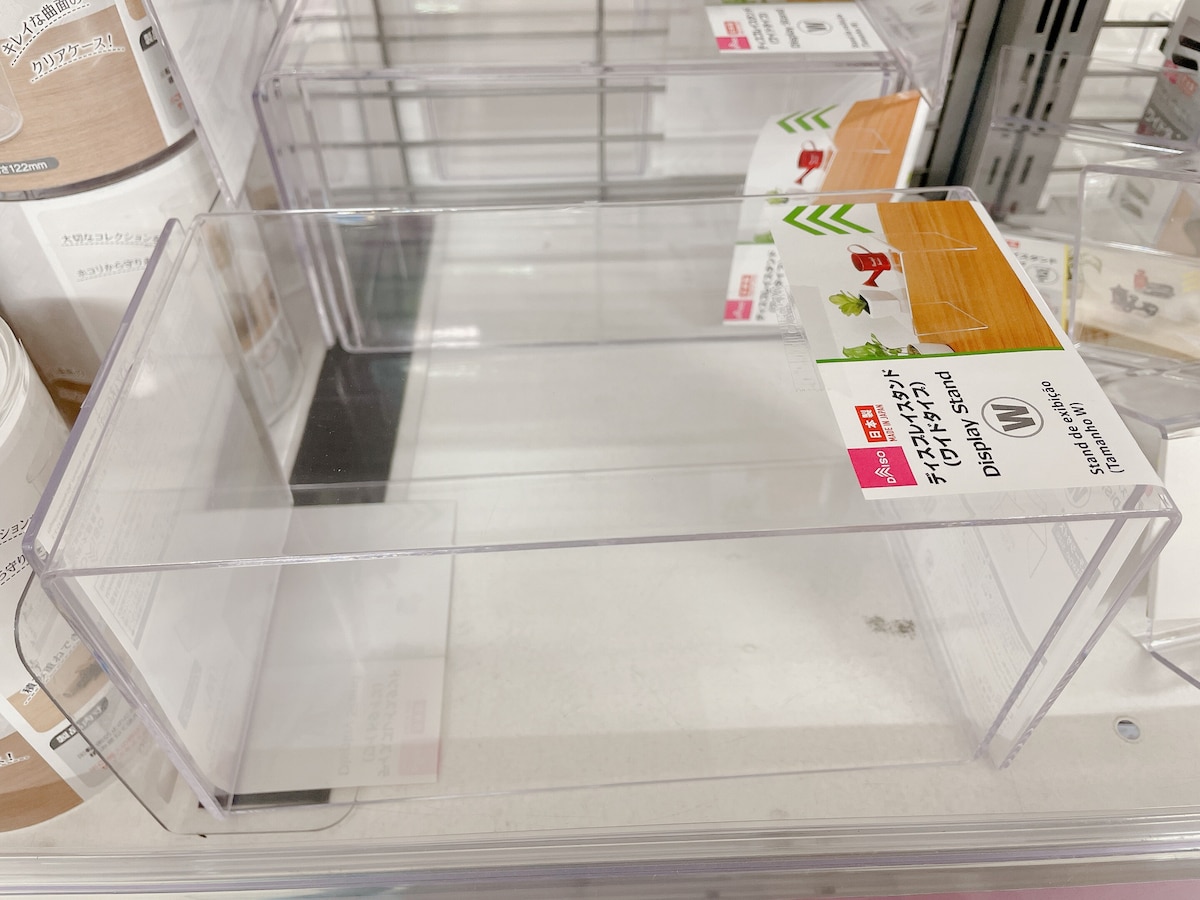 100均「ディスプレイスタンドLサイズ」の商品情報とサイズ・収納例。ダイソーで販売 4549131492026。