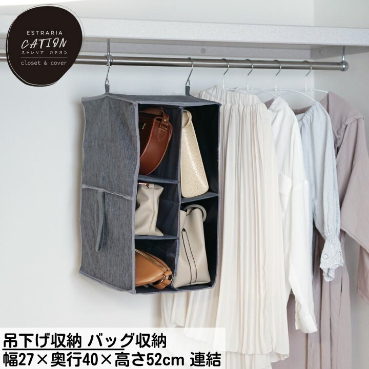 楽天市場 吊下げ収納 バッグ収納 クローゼット収納 衣類 小物収納 幅27×奥行40×高さ52cm連結できる 衣類 収納 整理 衣類整理 衣類収納小物収納 小物整理 吊下げ収納 小物 パイプハンガー 吊るす 吊るせる 洋服 ストレリアカチオン ハンギングラックバッグ用 グレー。