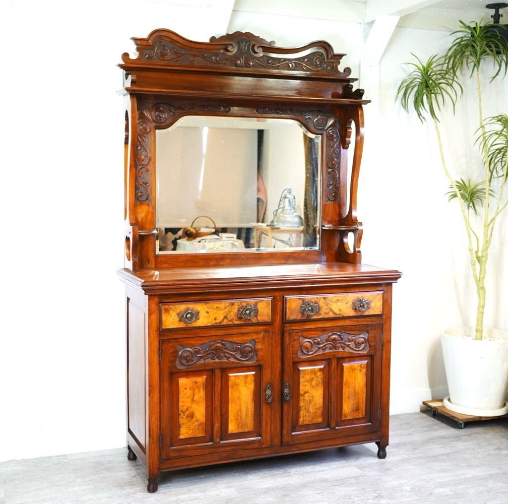 アンティーク ミラーバックサイドボード キャビネット 飾り棚 中古 引出し 大きい 鏡台 趣 英国 カップボード。