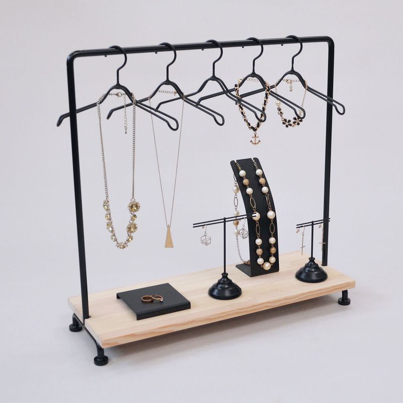 楽天市場 アイアンミニチュアラック棚板付きSサイズ:丸座無し 幅広タイプ :卓上タイプのアクセサリーや小物類の陳列用ミニチュアハンガーラックネックレス 吊るし物 雑貨 おしゃれ かわいい ディスプレイ用品 小物 店舗什器 ドール衣装 展示 手袋 アクセサリー 人形。