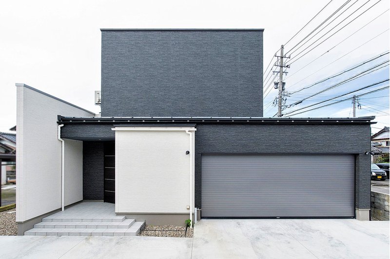 車一台を停めても余裕の広さのかっこいいビルトインガレージがある家の外観 - 事例写真「美容院を併用したスタイリッシュなガレージ ハウス」注文住宅のハウスネットギャラリ。