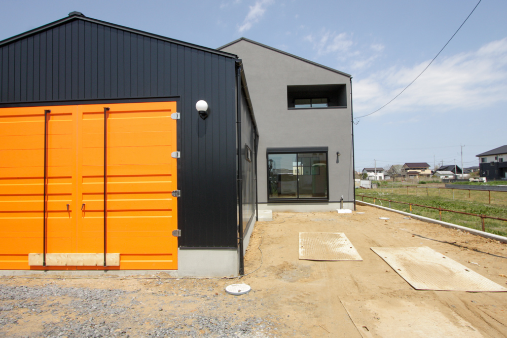 SUUMO平屋 中庭 インナーガレージ 瑞穂市 ネコとイヌも一緒。ゆったり間口がかっこいい平屋のガレージハウス - チェックハウス北方ショールームの建築実例詳細注文住宅。