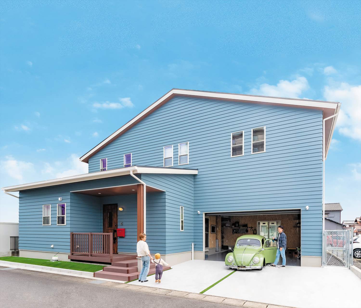 インナーガレージのある快適な間取りデザインと機能を活かした新築注文住宅ブルーハウスデザイン・性能・リゾートライフ、愛知、名古屋、豊橋、豊川、岐阜ならお任せください。