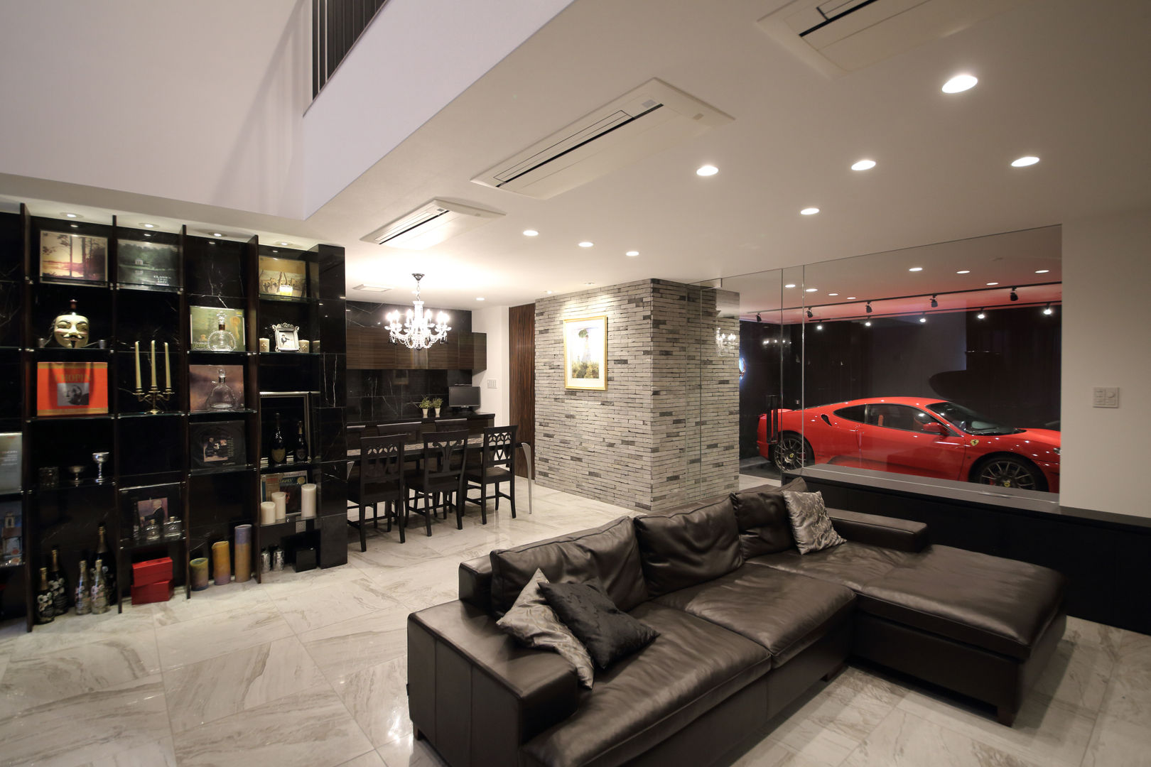 愛車を眺めるビルトインガレージの家サブライムホーム。