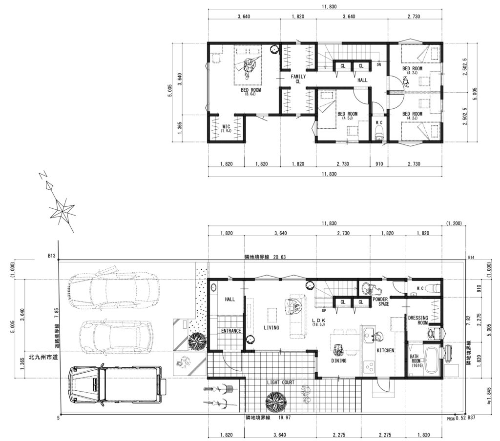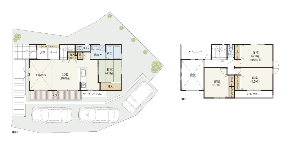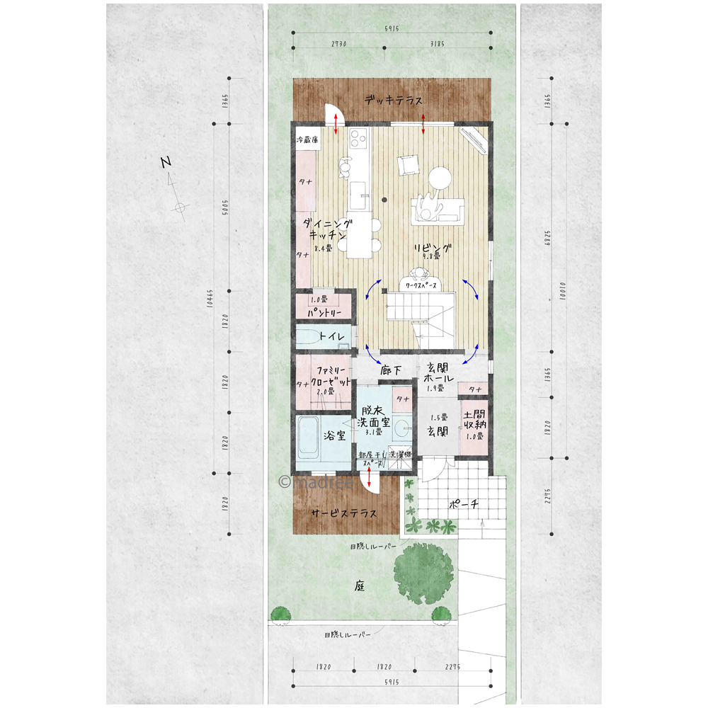 27坪〜30坪 3LDK吹抜で採光工夫、眺め生かす北側LDKの家の間取り図「madree マドリー 」。