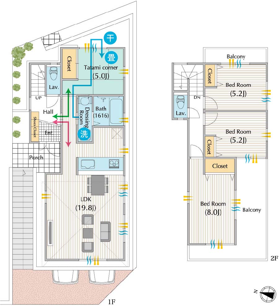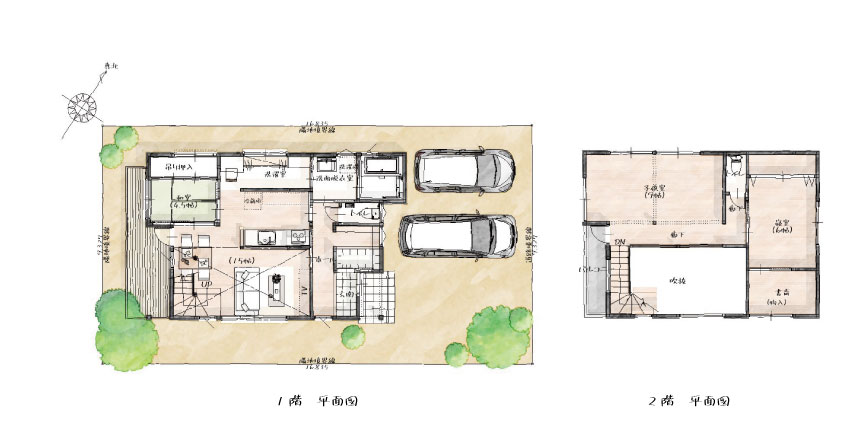 30坪台の間取り事例 2階建て・南玄関 住宅形状をいかした間取りポイント、アイディアを紹介福井の注文住宅・工務店ノークホームズ。