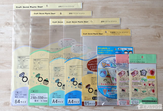 100均で購入したプラバンの商品一覧。プラ板の厚さやサイズ、枚数 ダイソー・セリアで100円。