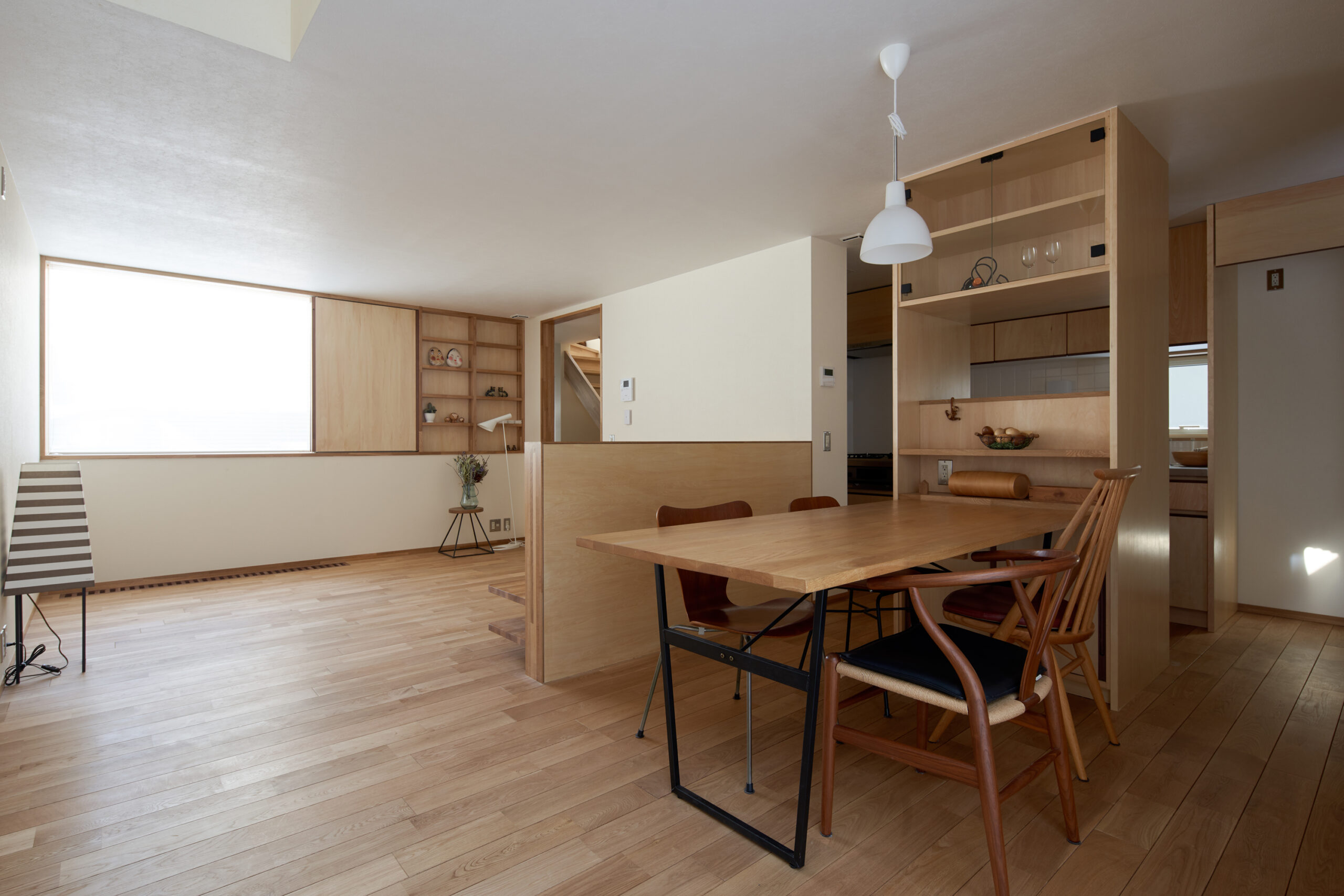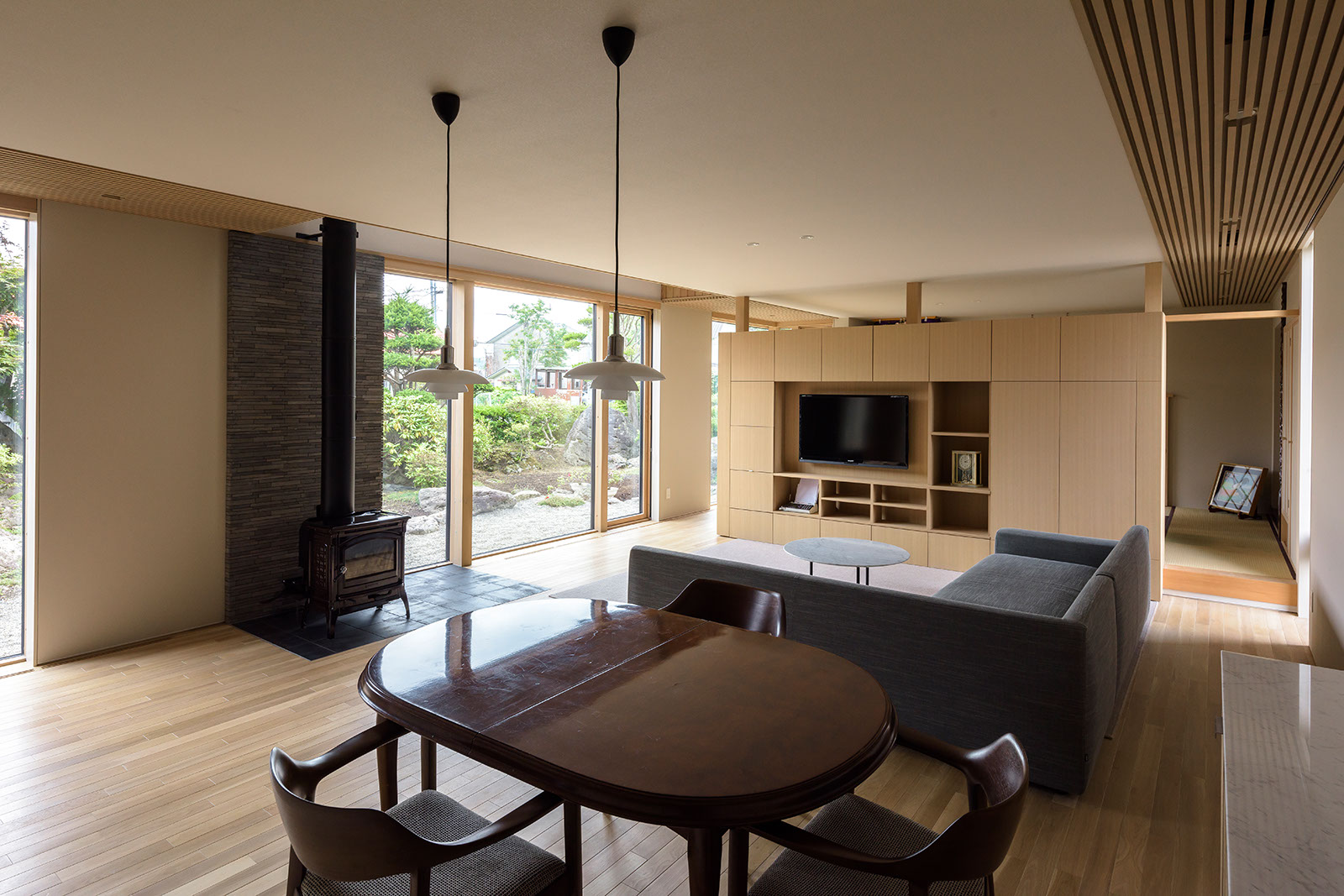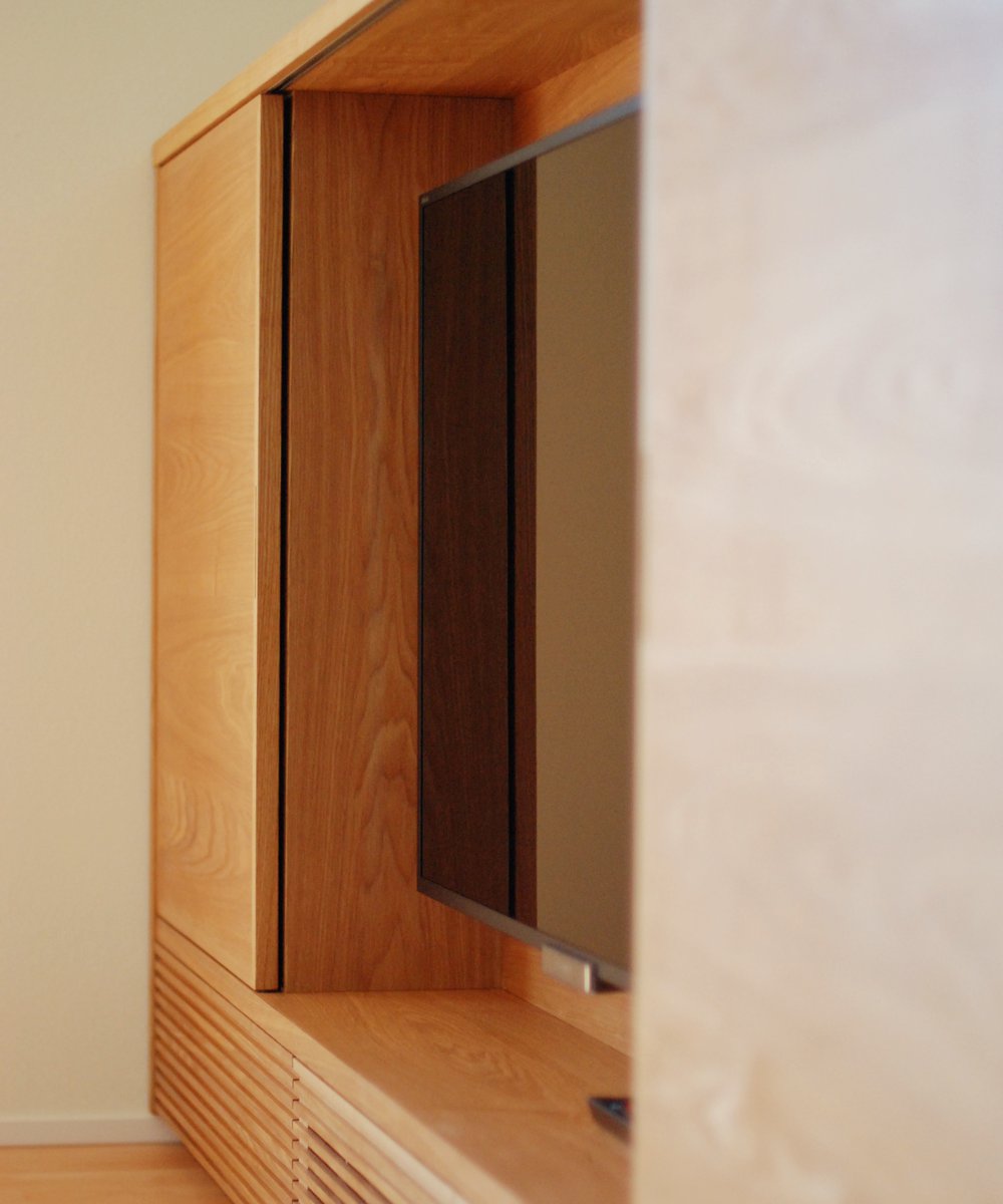 タモの間仕切りカウンタータイプのテレビボードゆるやかに優しくつながっている注文家具屋フリーハンドイマイ注文家具屋フリーハンドイマイ。