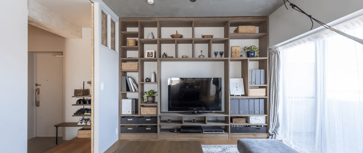 大きなテレビ台は圧迫感あり? テレビ収納以外にも壁や間仕切りに使えるDIYテレビボード - 片づけ収納ドットコム。