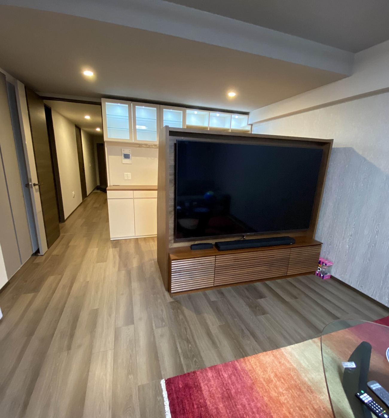 リビングの間仕切り壁をエコカラットで壁掛けテレビにリフォーム施工事例新築マンションオプションとリフォームのRe:Mansion。
