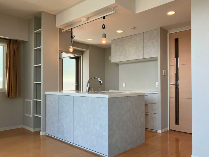 ホワイトスタッコラスティアッシュグレージュスタッコノクトカノールリクシルキッチンシステムキッチンオーダーキッチンキッチンリフォームリフォームマンション。
