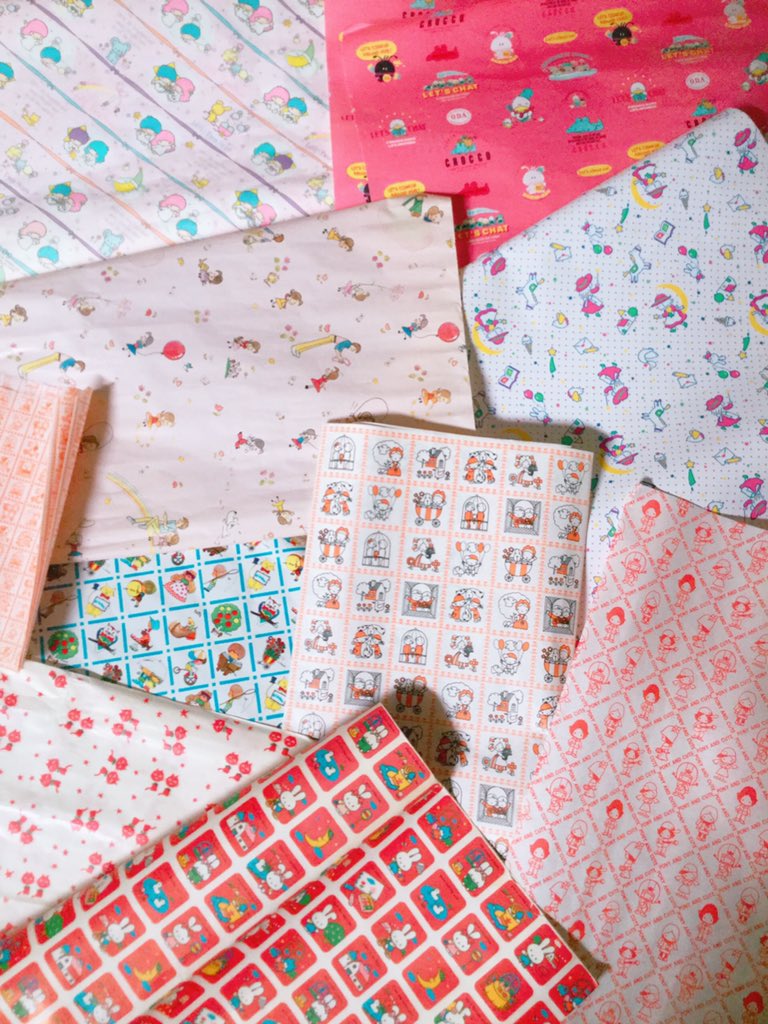 雑貨奥様 on X: "文房具店で買った包装紙を整理中です。 昭和の包装紙ってやっぱり可愛いです💕 先日買ったゴミ箱に丸めて立てて収納しようかと思います。#昭和レトロ #ラッピングペーパー #キキララ #バイキンくん #レッツチャット #みつはしちかこ #サンリオ。
