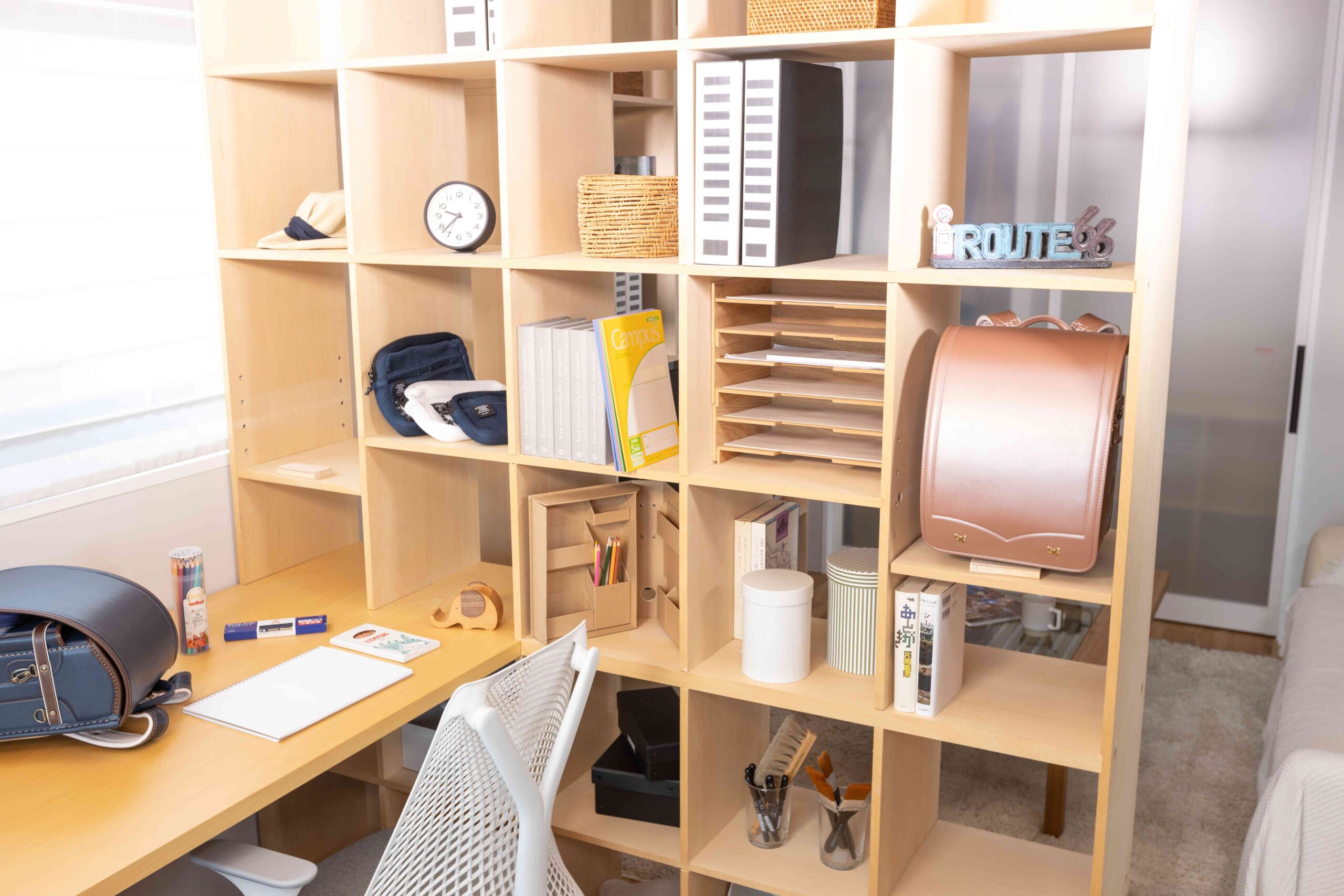 子供部屋に玩具ボックスを組み合わせた壁面収納 – 壁一面の本棚 奥行350mmShelf – マルゲリータお客様事例。
