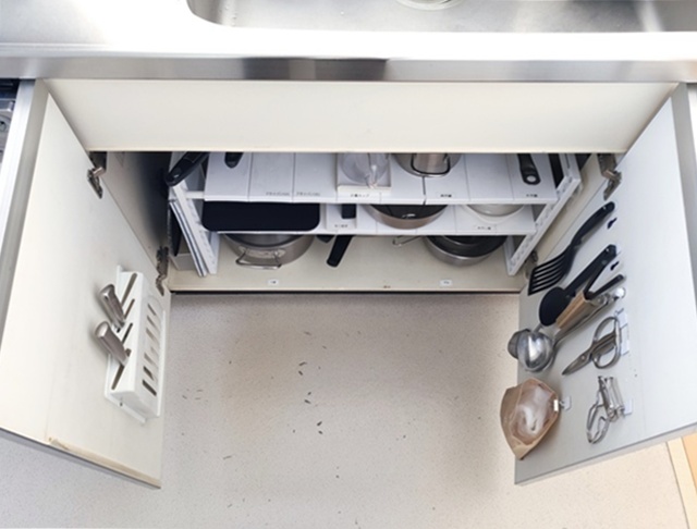 わが家の収納 扉収納でも大丈夫!シンク下収納は空間を区切るのがコツ&YouTube動画アップ片づけものさし。