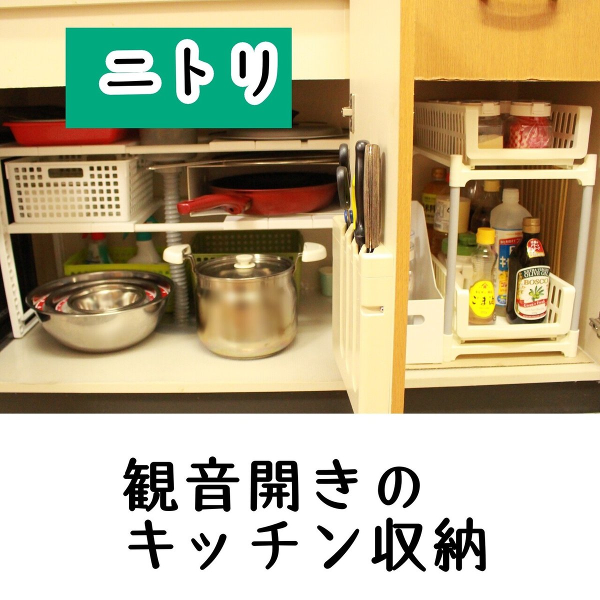 シンク下収納はニトリグッズでスッキリ整理!「観音開きタイプ」の収納アイデアヨムーノ。