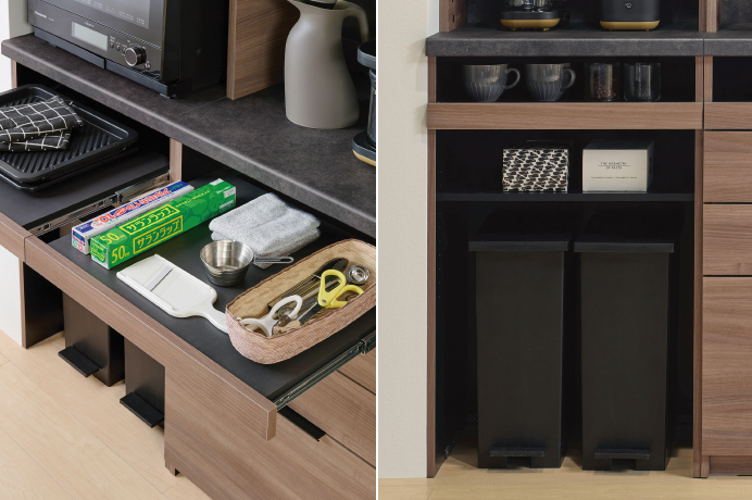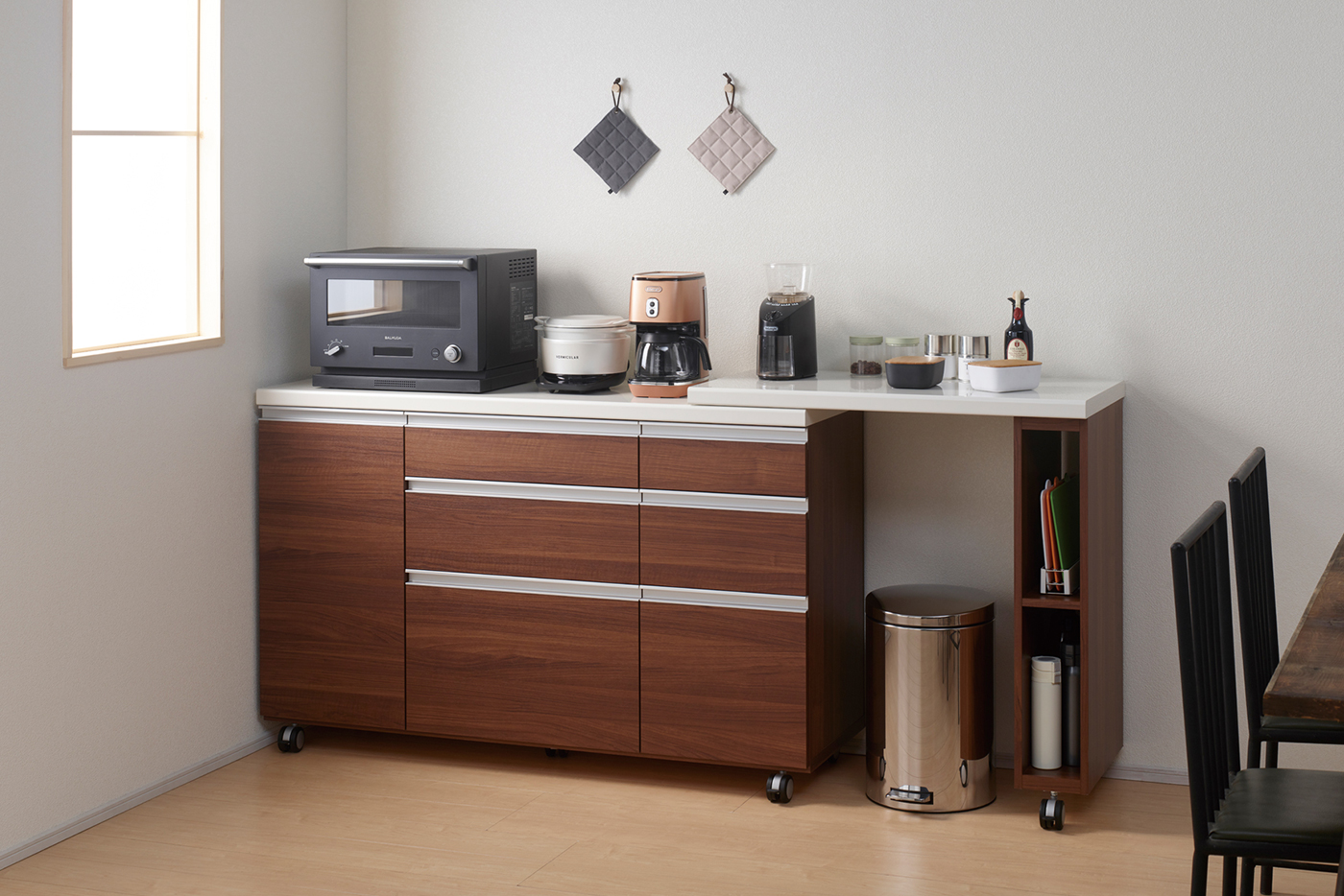 パモウナのサッと引き出せるカウンター付き食器棚「SY」♪カウンタースペースが使いたいときだけ広げられる。