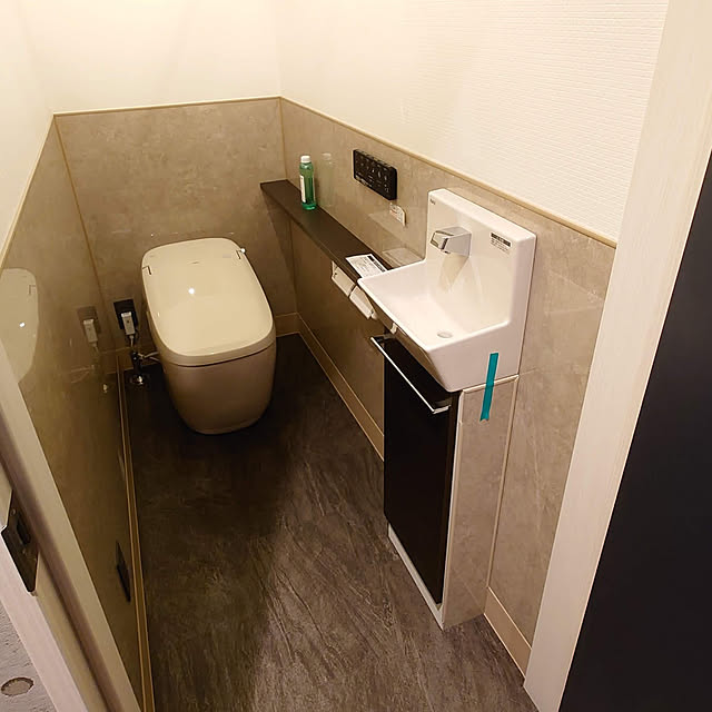 施工事例 1階トイレ🚽, 階段下の少し狭いトイレです🤏, トイレ裏には外部収納を設けた為、, 窓はありません🙅♀️,掃除管理をしやすいようにと, お施主様からパネル取付の希望があり、, 消臭タイプのものを腰部分まで使用しました😊,階段下トイレ,アイカセラール消臭タイプ,アメージュZA。