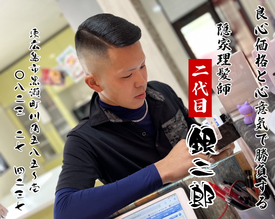 昭和のヘアースタイルを極めるバーバーショップ その名も 古民家Barber二代目銀二郎 と申しやす🤣 東広島市黒瀬町川角の隅っこでやっとります🥴昭和スタイルが好きなダンディ兄さんおいでよ銀二郎ヘ💃💃 ☆普通カットとシャンプーで2,000円 ☆スキンフェードカットと。