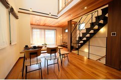 吹き抜けにすることで狭小地ながら広さも感じれるおしゃれな階段のあるLDK - 事例写真「狭小ガレージの家」注文住宅のハウスネットギャラリ。