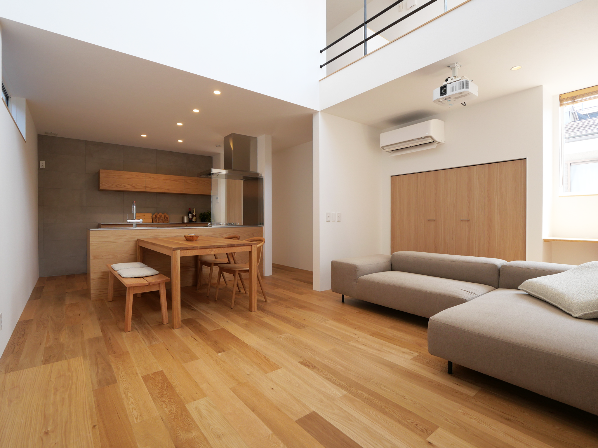 狭小地でも広々と過ごす。吹抜けで大きなスクリーンを楽しむ住まい事例湖都コーポレーション。